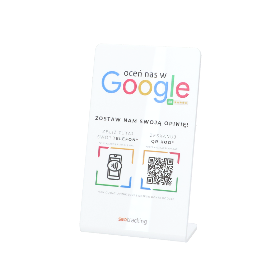 Prezenter SEOtracking® Universal to nowoczesne narzędzie, które pozwala Twoim klientom błyskawicznie wystawić opinię – wystarczy zbliżyć telefon lub zeskanować kod QR – i gotowe!